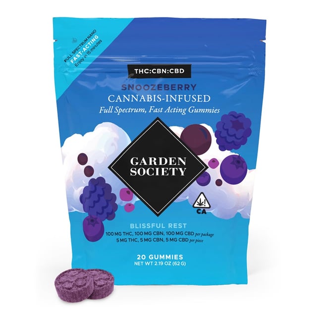 Garden Society Snoozeberry 1:1:1 gummies help guide to dreamland with the power combo of 5mg THC, 5mg CBN, and 5mg CBD. The delicious mixed berry notes are a cherry on top. Made with uncompromising, quality ingredients.