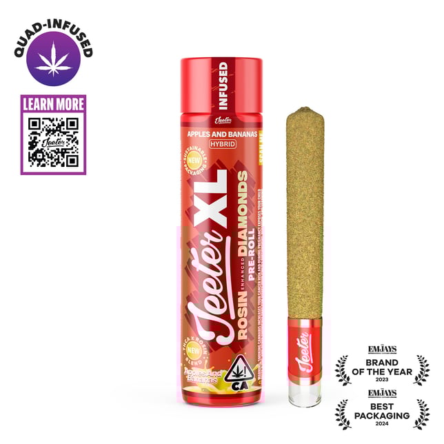 The Jeeter Quad-Infused Pre-Roll redefines infused pre-rolls by combining four premium enhancements for a superior smoking experience.. THCA diamonds provide high potency, rosin introduces a full-spectrum extract for richer depth and complexity, terpenes create a dynamic flavor profile, and kief ensures a smooth, slow burn. This purposeful infusion process delivers a more balanced and flavorful smoke. Alongside its enhanced formulation, Jeeter remains committed to sustainability, with new opaque packaging made from 25% post-consumer recycled plastic, reducing environmental impact without compromising the premium experience.
