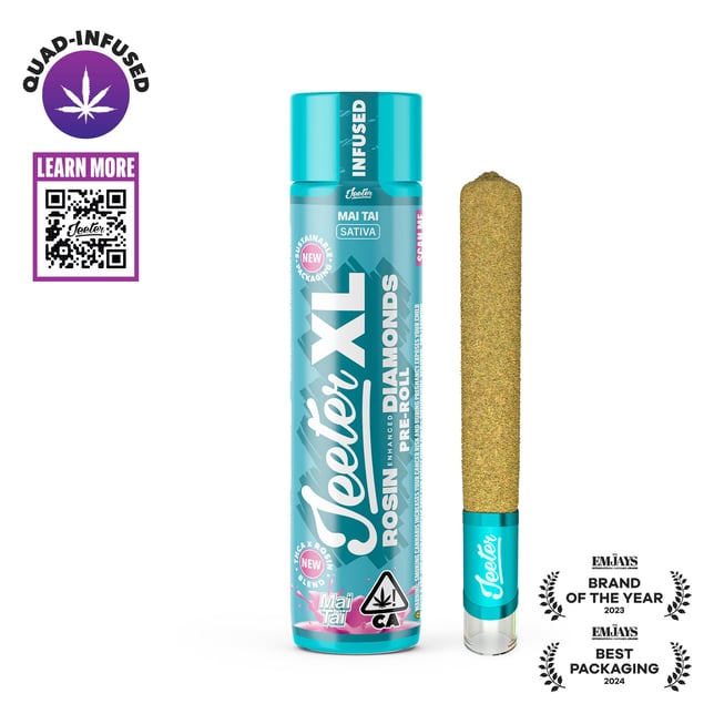 The Jeeter Quad-Infused Pre-Roll redefines infused pre-rolls by combining four premium enhancements for a superior smoking experience.. THCA diamonds provide high potency, rosin introduces a full-spectrum extract for richer depth and complexity, terpenes create a dynamic flavor profile, and kief ensures a smooth, slow burn. This purposeful infusion process delivers a more balanced and flavorful smoke. Alongside its enhanced formulation, Jeeter remains committed to sustainability, with new opaque packaging made from 25% post-consumer recycled plastic, reducing environmental impact without compromising the premium experience.